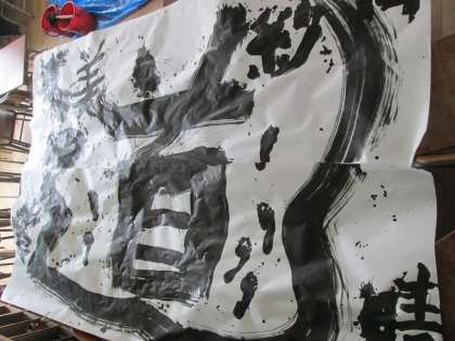 特大筆を購入し、巨大な半紙に児童が先生と一緒に一筆一筆「道」と書きました。