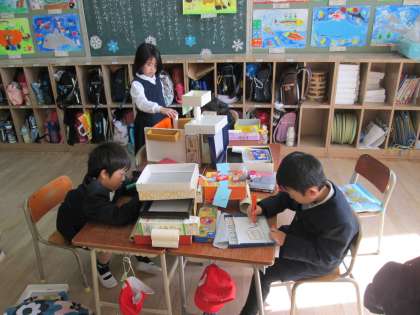 昨日の1年1組の図画工作はいろいろな箱を使って、自分のアイデアを生かした、おもしろい作品をたくさんつくっていました。