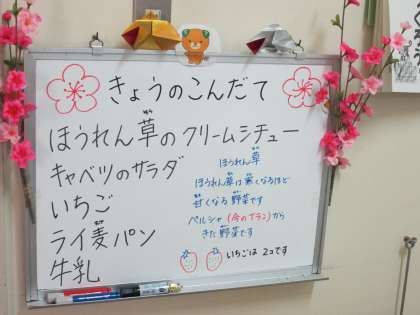 まずはホワイトボードの献立とボードの下の給食見本のディスプレイを担任の先生と一緒に確認をします。