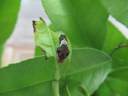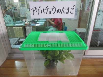 さて、管理作業員さんがアゲハチョウを作業員室の前で育てています。今は、たまごからかえって、写真のような幼虫になっています。
