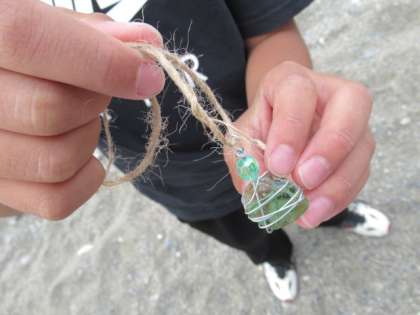 シーグラスや貝殻など、自分の好きな石や貝に針金とビーズと紐をつけて、アクセサリーを作りました。