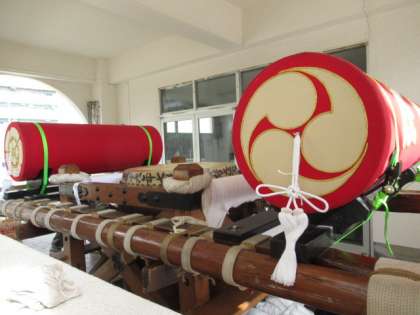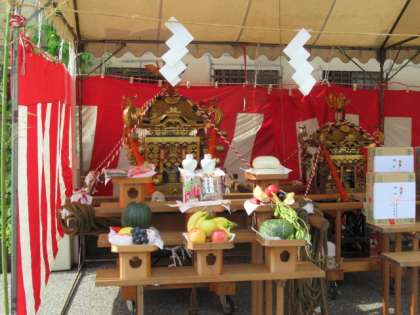 今日、明日に備えて、学校で地域の方がお神輿を組立ていたり、テントの中で神様へのお供えを準備されていました。
