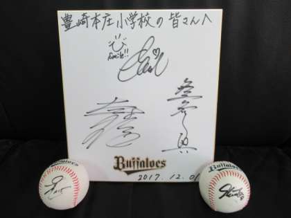最後に記念品もいただき、学校にも写真のようにご自身たちのサインをクラスと学校に、さらにはオリックスバファローズ現役選手 佐藤達也選手(背番号15)と 後藤俊太選手(背番号8)のサインボールもいただきました。