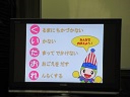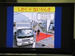 不審者に出会った時の「く・い・だ・お・れ」の合言葉や、交通安全(死角や内輪差)のお話がありました。少し難しい言葉もありましたが、自分の身を守るために気を付けること、トラックや車からは見えない場所もあることを学習しました。