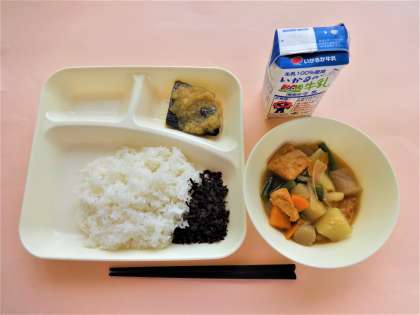 ご飯・牛乳・さごしのおろしじょうゆかけ・含め煮・牛ひじきそぼろ