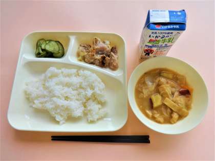 ご飯・牛乳・鶏肉の塩こうじ焼き・さつまいものみそ汁・きゅうりの甘酢あえ