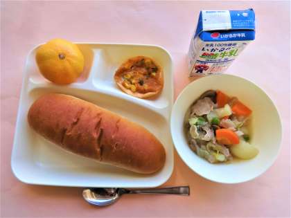 黒糖パン・牛乳・豚肉と野菜のスープ煮・変わりピザ・みかん