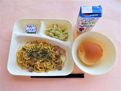 ミニコッペパン・牛乳・ウインナーときのこの和風スパゲッティ・焼きツナキャベツ・固形チーズ