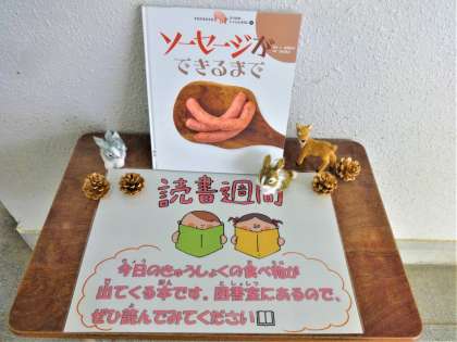 その中で、給食の時間に図書委員会の児童がその日の給食に関係のある本の紹介をしています。給食室前にも展示し、児童も興味津々の様子です。