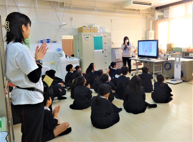 養護教諭の先生から説明をしてもらい、動画を見ながらみんなで手を洗う動作をして、いつもの手洗いを見直しました。