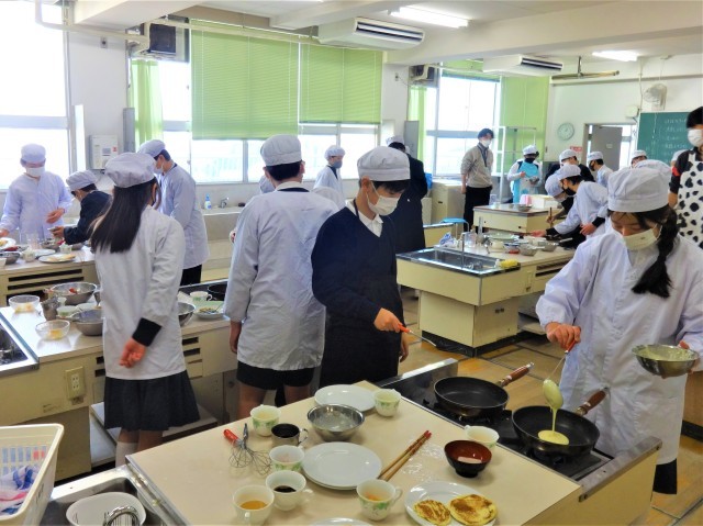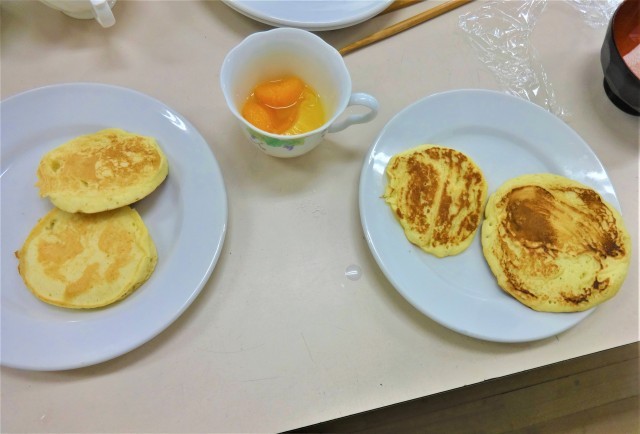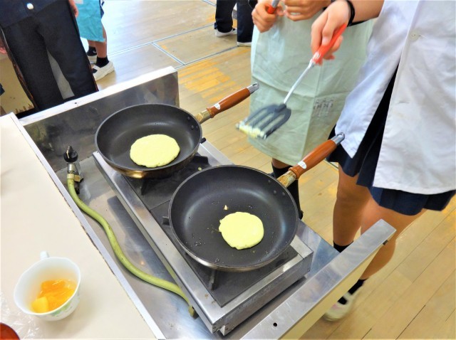 フライ返しでひっくり返すことに一苦労しながらも、協力して楽しく美味しく作ることができていました。