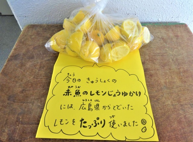 今日は、広島県産の国産レモンをたっぷりと使用し、果汁をしぼってレモンじょうゆだれにしました。