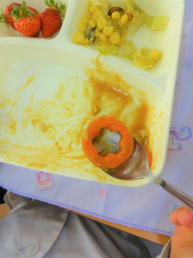給食調理員さんが、にんじんを桜の型に抜いてお祝いのカレーライスにしてくれました。