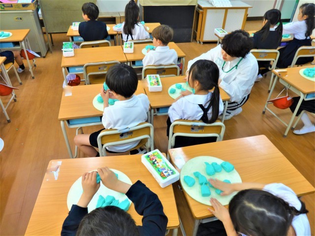 1年生は、「すきな〇〇をつくろう」のめあてで、粘土をしていました。
