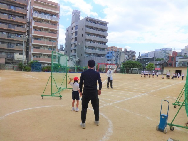 2年生は体育で新体力テストのソフトボール投げの記録を取っていました。