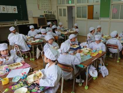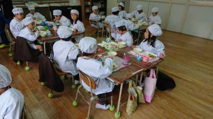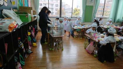 昨日に続き、1年生の給食の様子です。今日の献立は「カツカレーライス、フルーツ白玉」でした。カレー大好き、フルーツ大好き、という児童も多く、おかわりに並ぶ児童もいました。