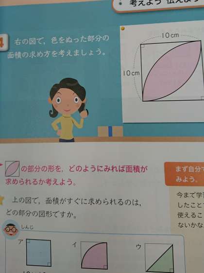 円の面積を求める学習をしています。今日は少し複雑な図形の面積の求め方を考えました。