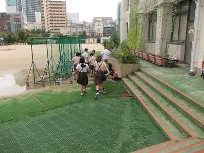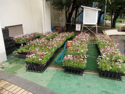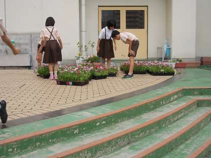 鉄棒の前においてあった、ナデシコの花苗を、環境美化委員会の児童がスロープ横に移動させました。1600株ほど、育っています!