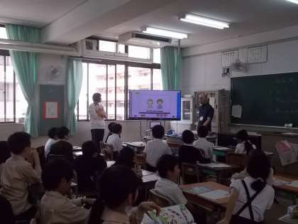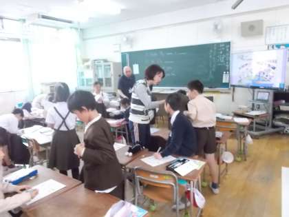 3・4年生にとって、今年度初めてのカーン先生との英語の学習です。3年生では自分の名前を英語で伝える表現、4年生では天気の表現を学習し、学習した英語を使って友達どうしで質問し、答える活動をしました。とても積極的に活動することができました。