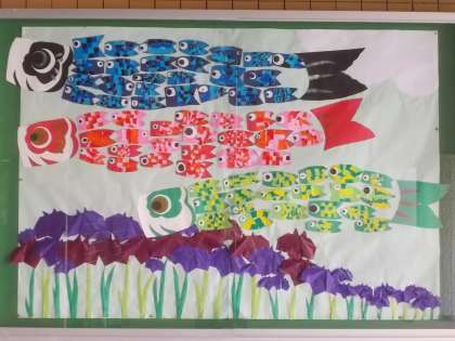 10連休が終わり、久しぶりの登校です。連休の間に5月になり、玄関掲示が新しくなりました。今月は4年生が作成した「こいのぼり」です。うろこを一つずつ見てみると、子どもたちの工夫している様子が伝わってきます。どうぞご覧ください。