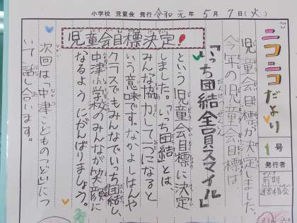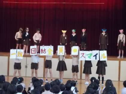 本日の児童集会で、児童会目標が「一致団結全員スマイル」に決定したことが児童会より発表されました。劇を交えて児童会目標を発表するという工夫もあり、ほとんどの児童が児童会目標を覚えたことと思います。児童みんなで「一致団結」して「全員スマイル」の中津小学校にしましょう。