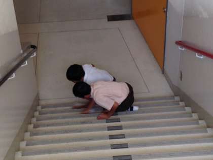 休み時間に5年生の児童が2人、廊下階段のよごれ(習字の墨や、給食の汁の乾いたものなど)をぞうきんで拭き取っていました。