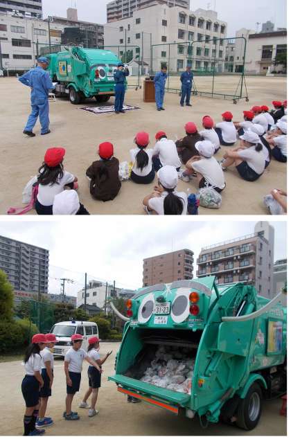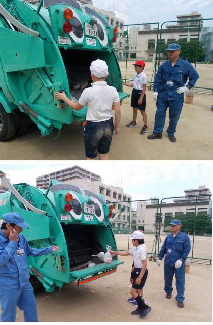 環境局の方による出前授業を行いました。運動場では、パッカー車にごみを入れ、ごみが収集される様子を間近で見ることができました。また、パッカー者に乗せていただくという体験もできました。