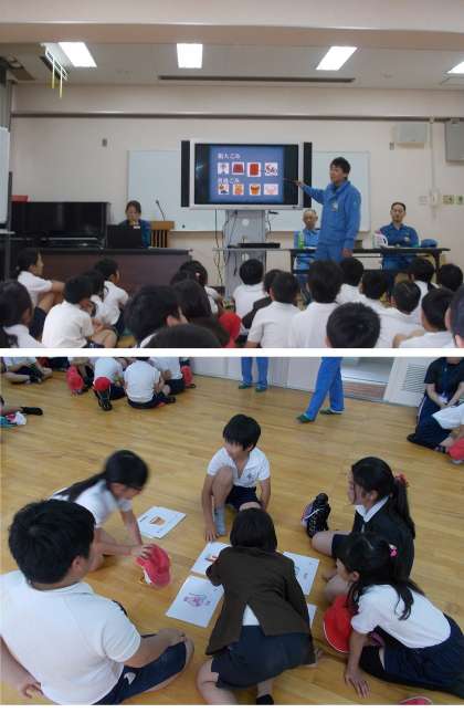 多目的室では、ごみの分別にについて学習し、グループごとに分別について考え、仕分けるクイズに挑戦しました。