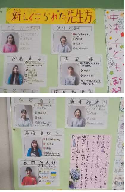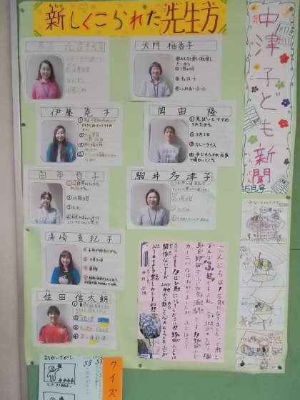 新聞委員会の児童が作成している「中津子ども新聞」5月号が完成し、職員室前の掲示板に掲示しています。今月号のテーマは、今年度新しく中津小学校に来られた教職員の紹介です。新聞委員会の児童が教職員に取材し作成しました。新聞は今日から掲示されており、登校してくると多くの児童が新聞を前に立ち止まり興味深く読んでいまいた。