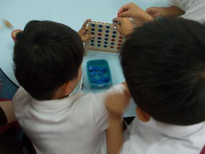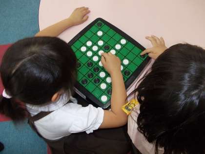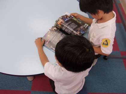学校探検で案内してもらった「バナナホール」と「ふれあいホール」での過ごし方について学習しました。この二つの広場には、たくさんの本や遊び道具があります。過ごし方のルールを学ぶとともに、備えている遊び道具を使って遊びました。