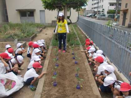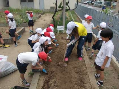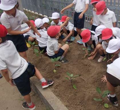 学習園を耕し、なすの苗を植えました。これから育てるとともに、成長の様子を観察していきます。どのように育つか楽しみですね。