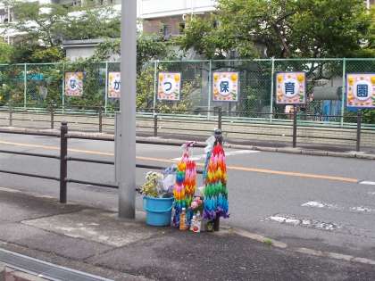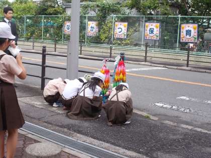 集会の後には、同級生として共に過ごした4年生児童全員で、事故のあった場所にお参りにいきました。お供えしたたくさんの鶴は4年生児童、保護者の方々が気持ちを込めて作ったものです。