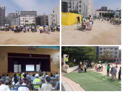 中津小学校、YMCA国際学校で地域総合防災訓練が行われています。防災リーダー、消防署、地域の方々を中心に避難訓練、安否確認の後、防災についての講話、水消火器体験、けむり体験など非常時に備えて様々な取り組みが行われています。