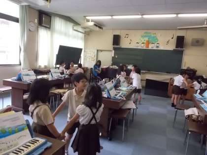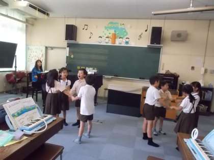 音楽室から楽しそうな歌声が聞こえてきたので、様子をみると2年生が音楽の学習をしていました。「かえるのがっしょう」を体を動かしながら歌っていました。順番を変えながら、グループごとに輪唱しました。楽しく歌うだけでなく、高さに気をつけて歌うことができました。