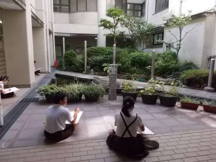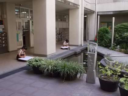 「わたしの好きな場所」というテーマで中津小学校のいろいろな場所の中から描きたい場所を選んで描いています。入学から6年目、児童それぞれの思いが絵に表れています。