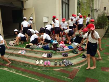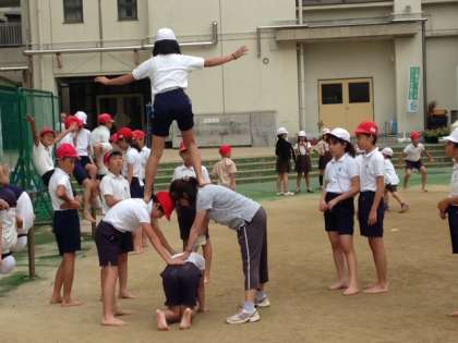3,4時間目は、組体練習です。裸足になって準備完了です。