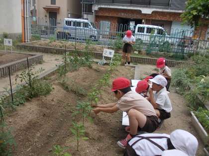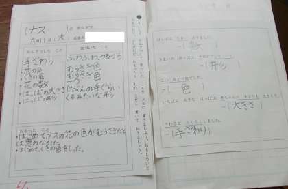 「かんさつしたことを書こう」の学習をしています。今日は学習園で育てているナスを観察し、色や、形、大きさなどについて詳しく表現することを意識して観察カードを書きました。