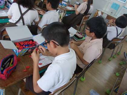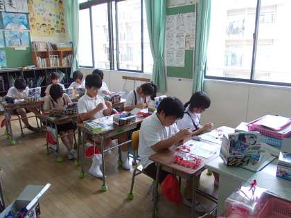 「電気のはたらき」の学習をしています。これから、モーターのまわる向きや速さを調べるための実験をしますが、その準備として実験道具を作っています。少し時間がかかりましたが、導線やモーターなどに触れ、これからの学習に意欲が出てきたようです。