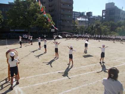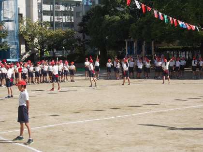 応援団練習。団長「○○の色は?」みんな「赤!」「白!」と答えます。