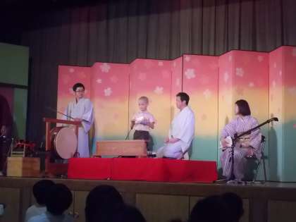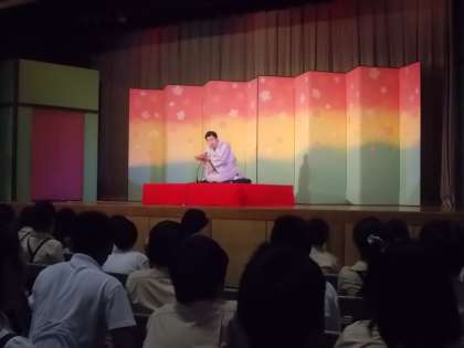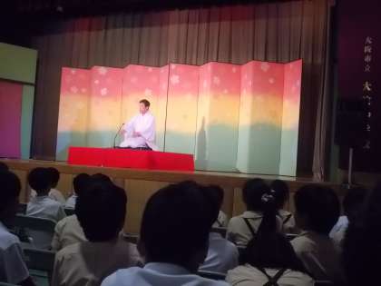 大淀中学校に行き、大淀小6年、大淀中1年とともに芸術鑑賞会(落語)を行いました。