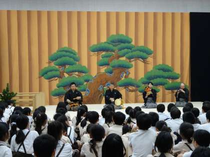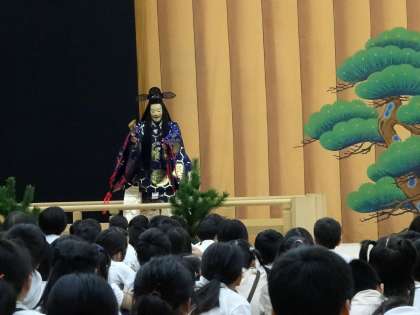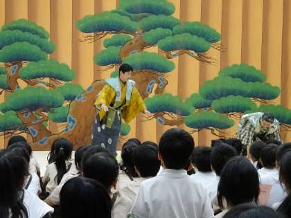 北区内の5校の5年生が大淀コミュニティセンターに集まり、能・狂言の芸術鑑賞会を行いました。狂言「附子」能「高砂」を鑑賞したり、謡を謡ったりし、日本の伝統芸能を亜体験しました。