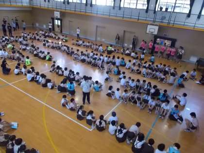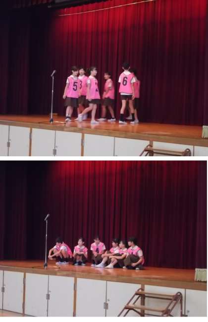 今週のなかよし集会は「○○でならぼう」でした。「な〜らぼならぼ♪」の歌に合わせて班で円形になって歩いた後、出されるテーマに合わせて順番に並びます。今日のテーマは「6年生から学年順」「名前の順(五十音順)」「誕生日順」などがありました。