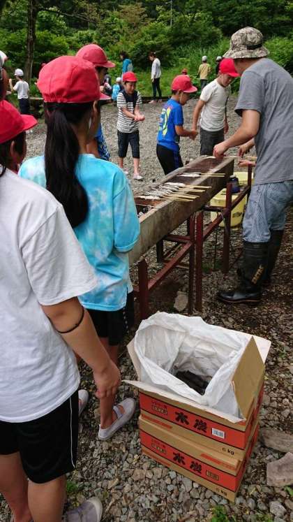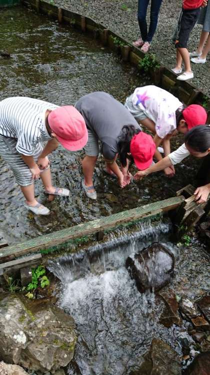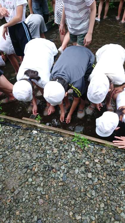 泳いでいる魚はあと少し。協力してつかもうとしています。