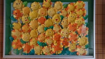 玄関の掲示板には2年生児童が作成した、すてきナイスグループひまわりがたくさん咲いています。