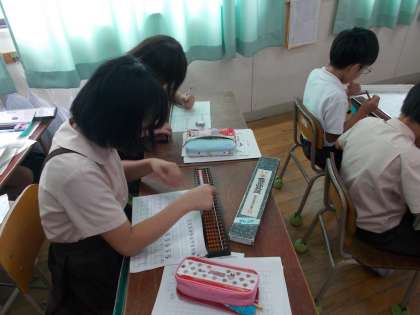最初に、先生が言う問題をよく聞いて、そろばんを使い、たしたり引いたりして答えを出しました。先生の声に耳を傾ける集中力はとてもすばらしかったです。