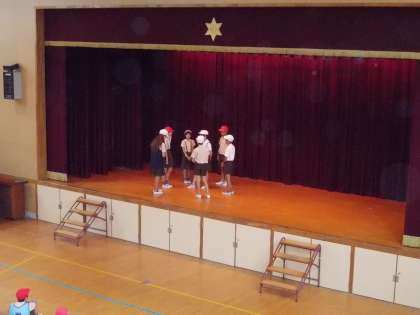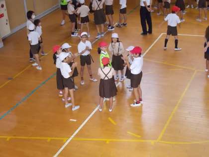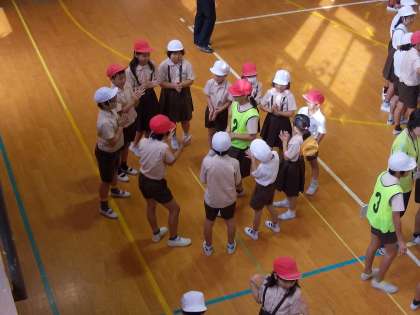 2学期になって初めてのたてわり集会です。鬼を班のメンバーで囲み、誰か(リーダー)の動きにみんなが合わせていきます。誰がリーダーであるのかを鬼が探すゲームです。