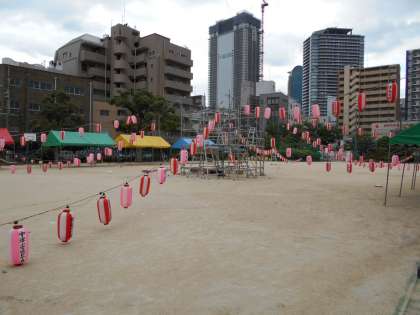 中津小学校の運動場では、明日の納涼祭の準備が進んでいます。色とりどりの提灯がつけられると、一気にお祭りモードになってきています。。楽しみですね。明日、天気になあれ。