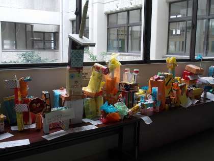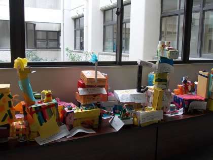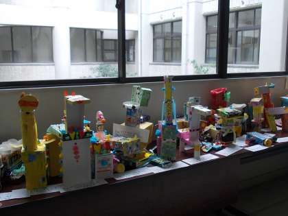 算数「かたち」で学習した箱を使って、図工で「どうぶつむらのピクニック」をしました。