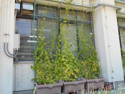さて、校内を散策していると中津小学校の「緑のカーテン」を見つけました。夏の強烈な日ざしがあるときに木陰に入ると涼しく感じられますよね。それは植物の葉から水分が蒸散されることで、周囲の温度を下げてくれるからです。それと同じようにつる性の植物をカーテンのように育てて、日光を遮ったり和らげることで室温の上昇を抑えたり、植物の間を通り抜ける風が冷やされることで家の中を快適にすることができます。それが「緑のカーテン」です。