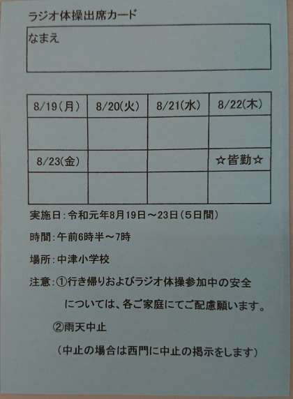 始業式を前に、来週の月曜日8月19日(月)から23日(金)までの間、中津小学校の運動場でラジオ体操があります。1学期に申し込みをした人はもちろんですが、申し込みをしていない人も参加できますので、ぜひ参加してください。